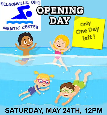 The City of Nelsonville Aquatic Center will open for the 2025 summer season on Saturday, May 24, 2025, at 12:00PM, weather permitting, because of the predicted cool temperatures for the weekend.