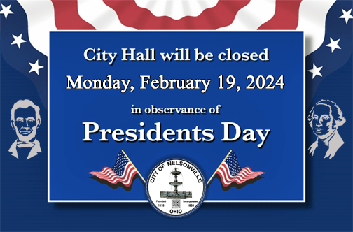 The City of Nelsonville announces that all City offices will be closed on Monday, February 19, 2024, in observance of President’s Day Holiday. City offices will re-open for business on Tuesday, February 20, 2024, for regular business hours.